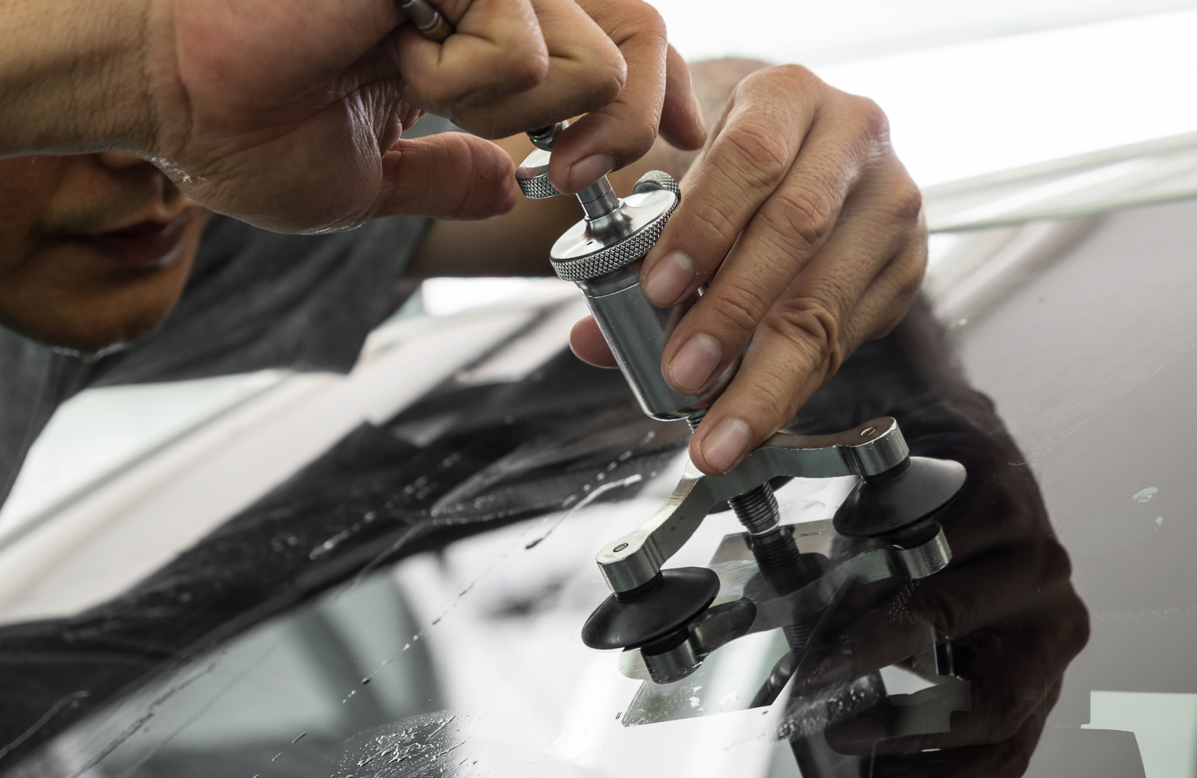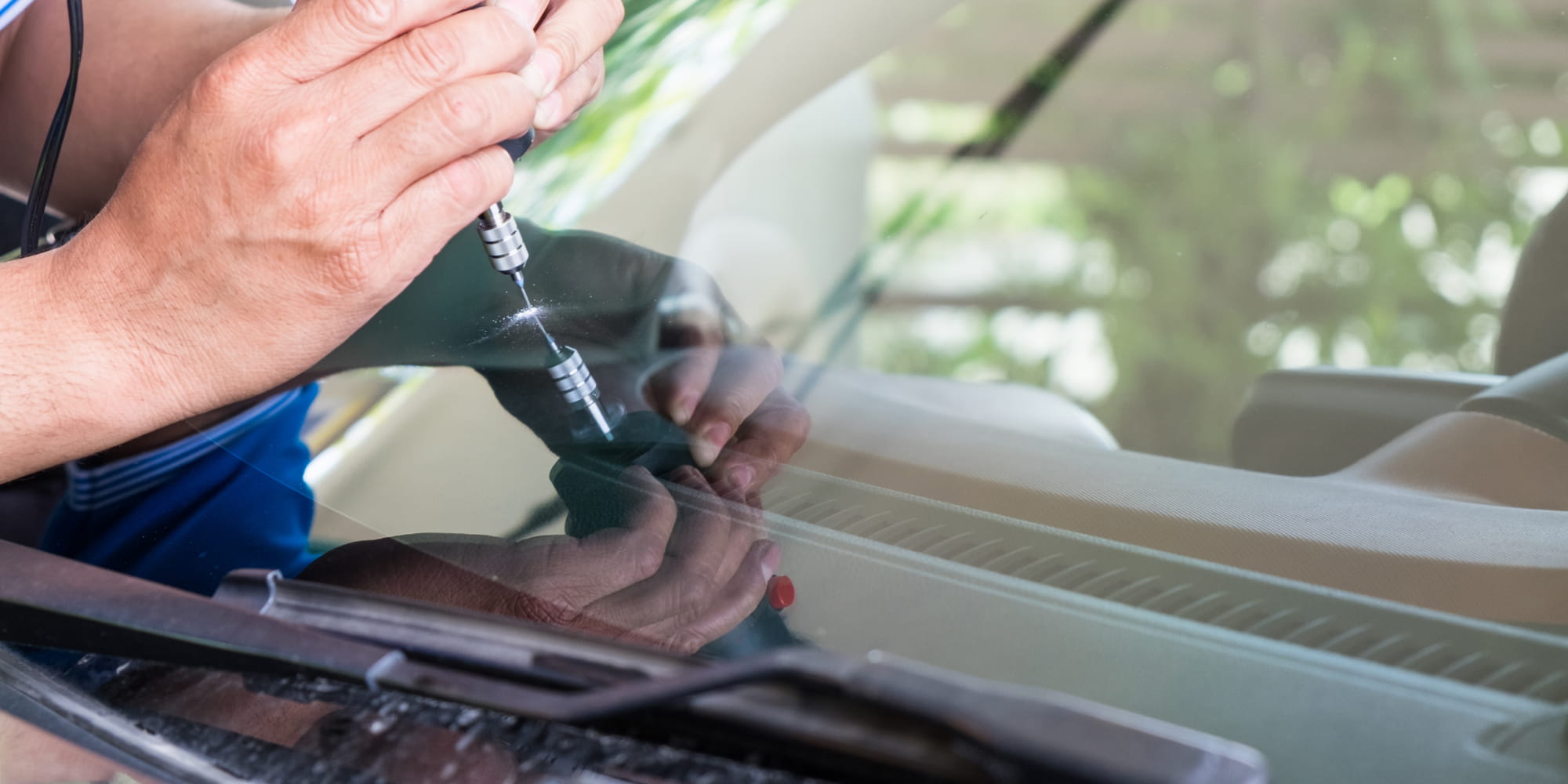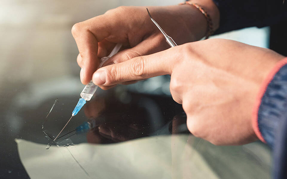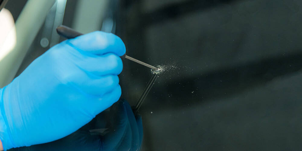飛び石などで傷付いたガラスの修理には、ひび割れの中に入ってしまった空気を抜き、レジンを入れる作業を行います。